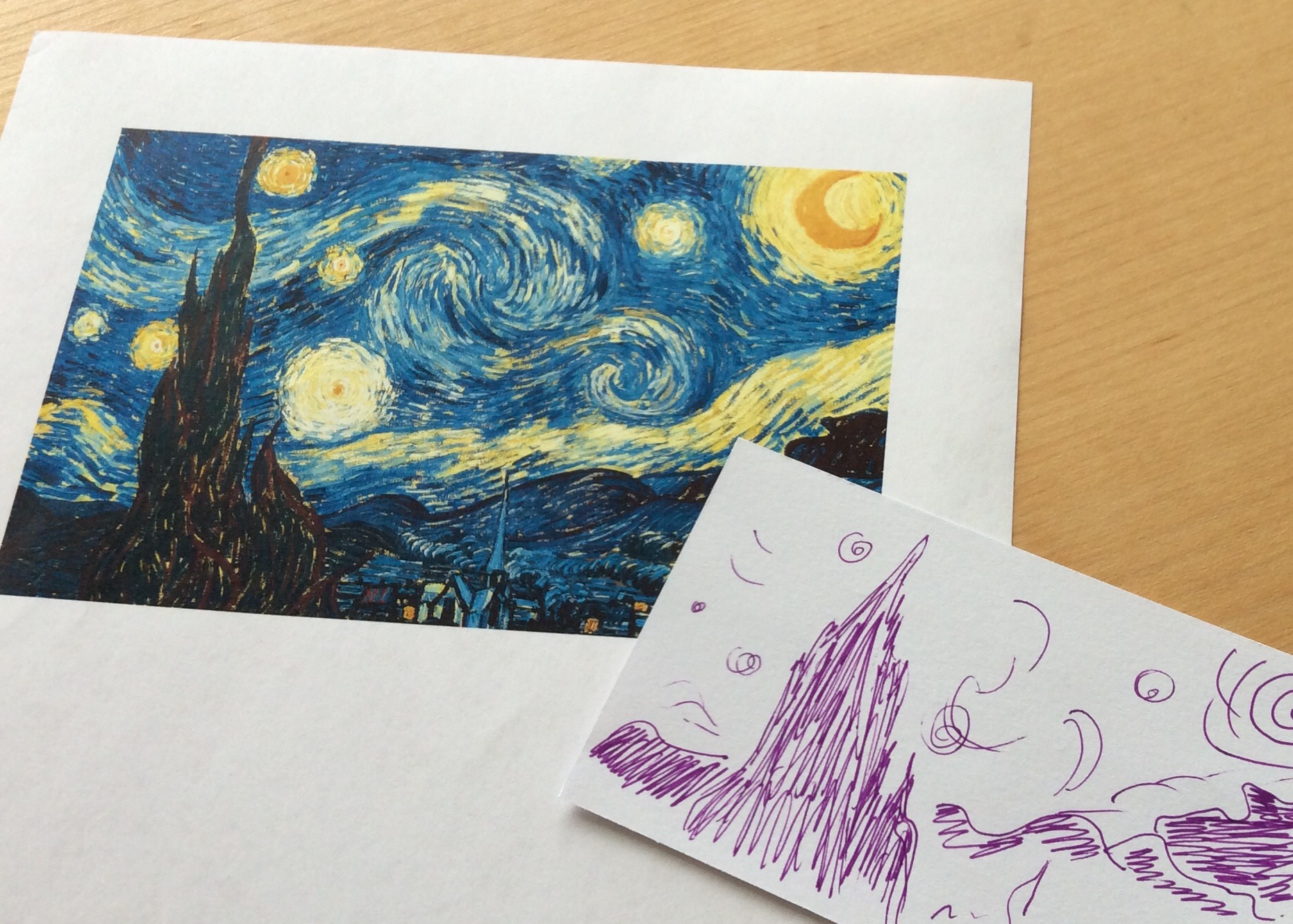 In her introduction, she offered us each an index card and a color reproduction of Van Gogh’s Starry Night. She asked us to draw it on our index cards. While we were drawing, she reminded us to make it look as much like it as possible, and to finish up in five minutes. There was a lot of chatter and giggles, even a little bit of whining. Then she asked us to write down how the assignment made us feel, upon request and as we worked.