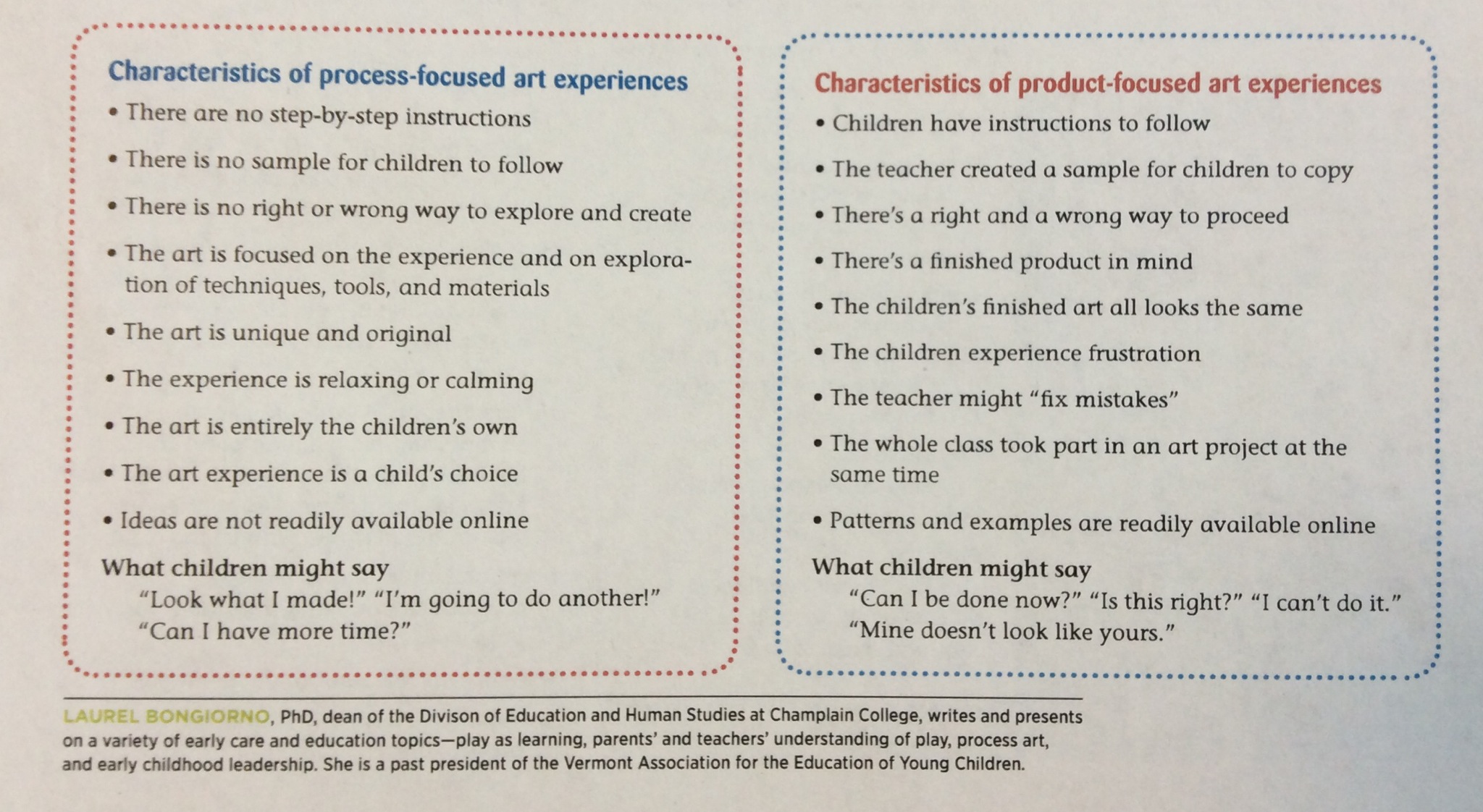 There is a wonderful handout from our instructor Laurel Bongiorno of Champlain College that highlights the main differences between product and process focused art: